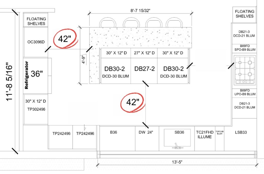 If two people need to move around simultaneously, increase it to 48 inches. - Between opposite work areas (e.g., countertop and island):