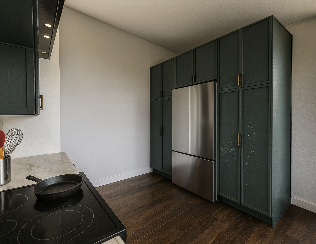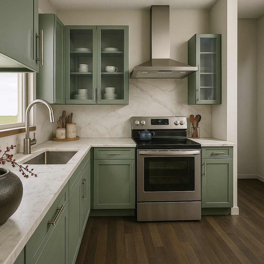 This kitchen remodel was thoughtfully designed to maximize every inch of space, creating a more open and functional layout without expanding the footprint. The cabinetry is finished in a trendy sage green—a popular choice that brings a sense of calm and sophistication. Gold hardware adds a warm and modern contrast, while the classic white farmhouse sink serves as a charming focal point, blending rustic appeal with contemporary elegance. The result is a refreshed and inviting kitchen that feels both spacious and stylish.