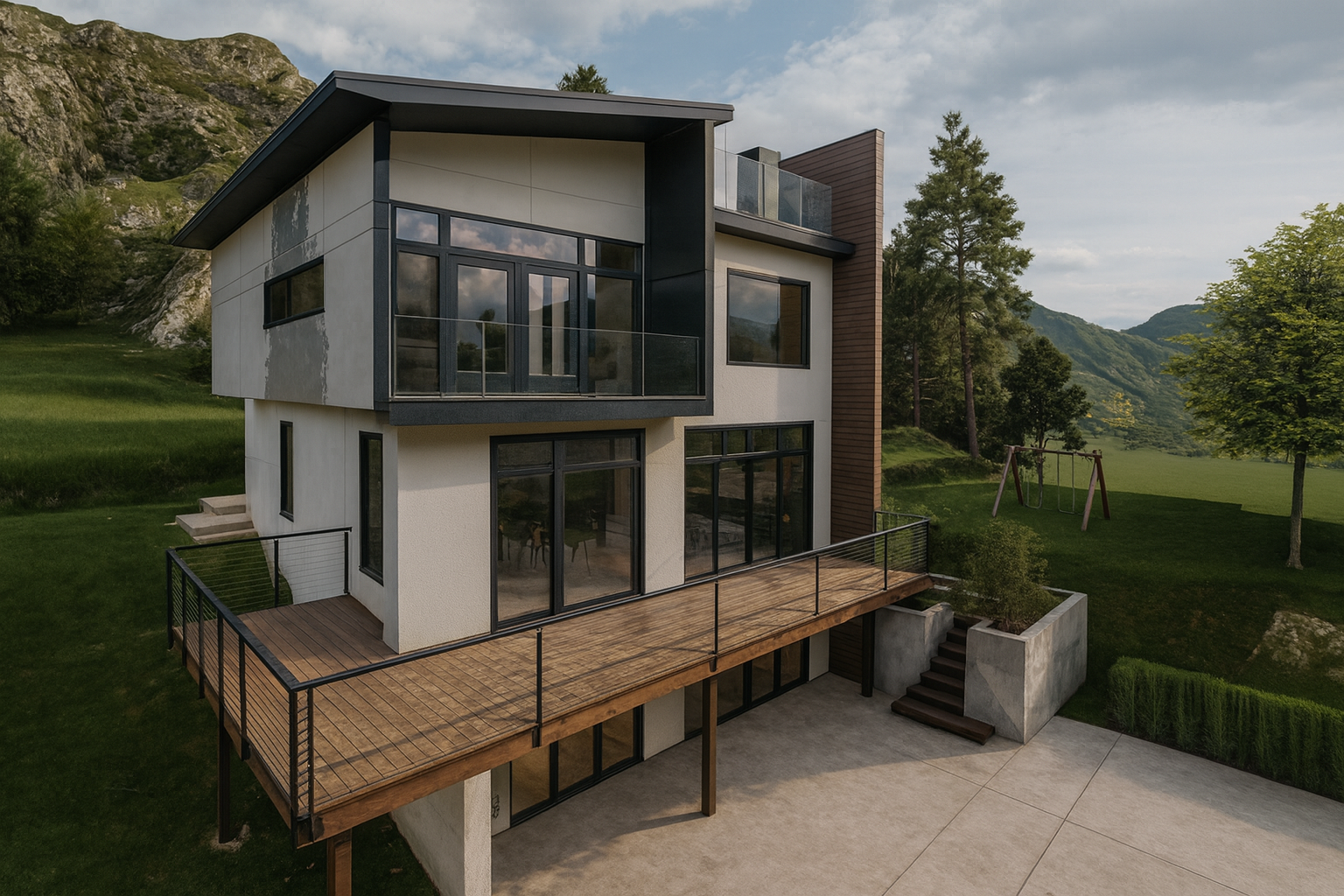 The exterior is elegantly finished with Alucobond panels, european siding norwegian board, and stucco, providing a sleek, durable, and sophisticated look.