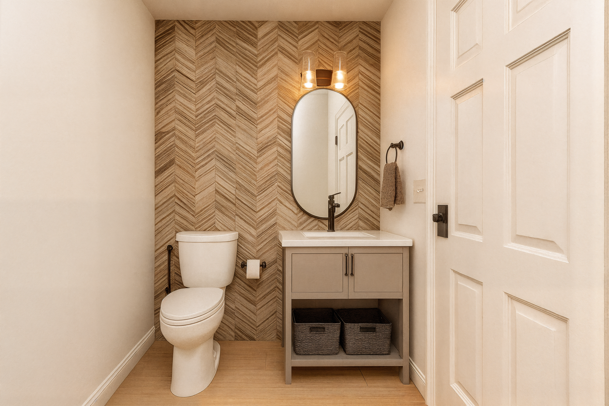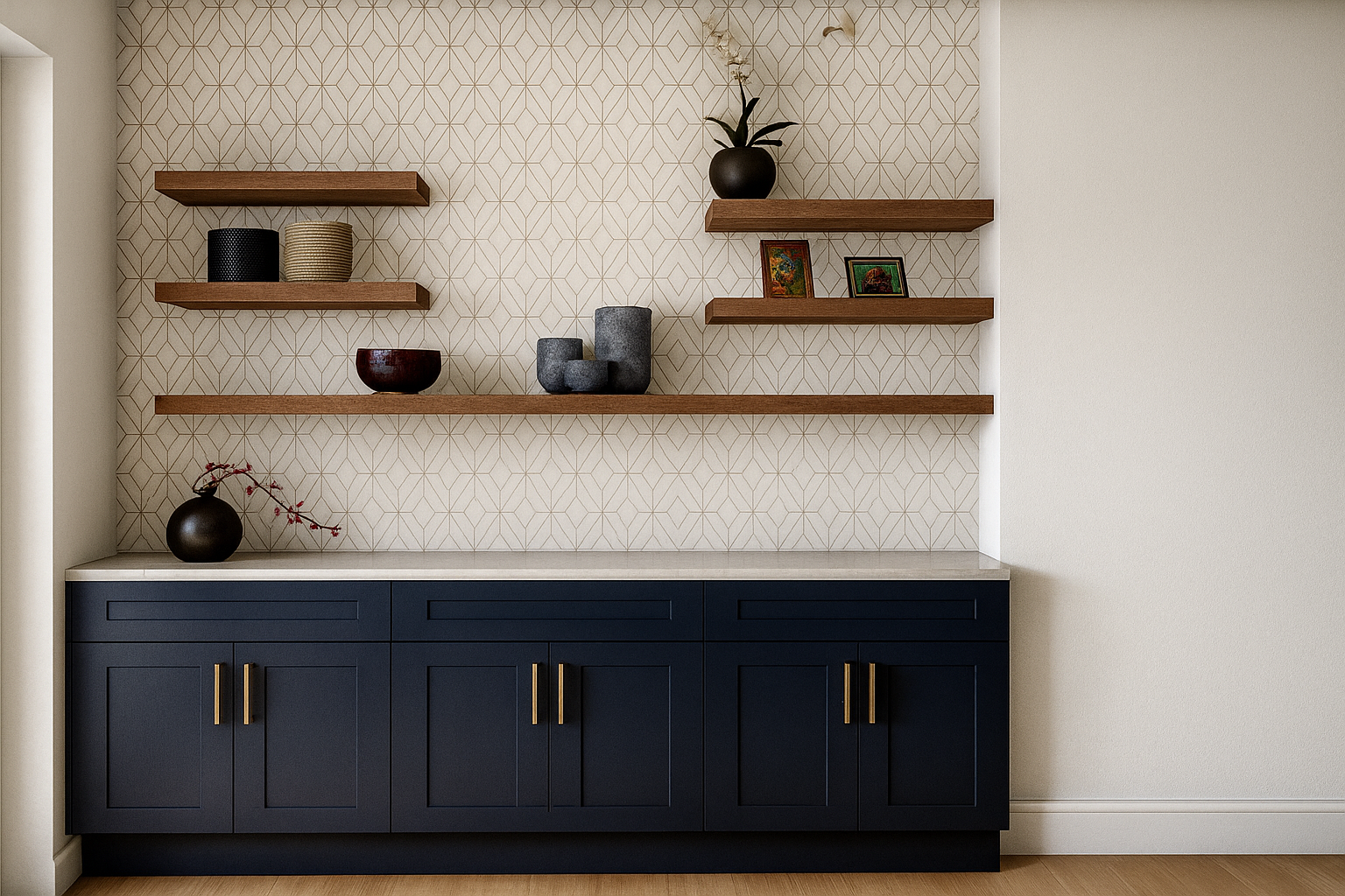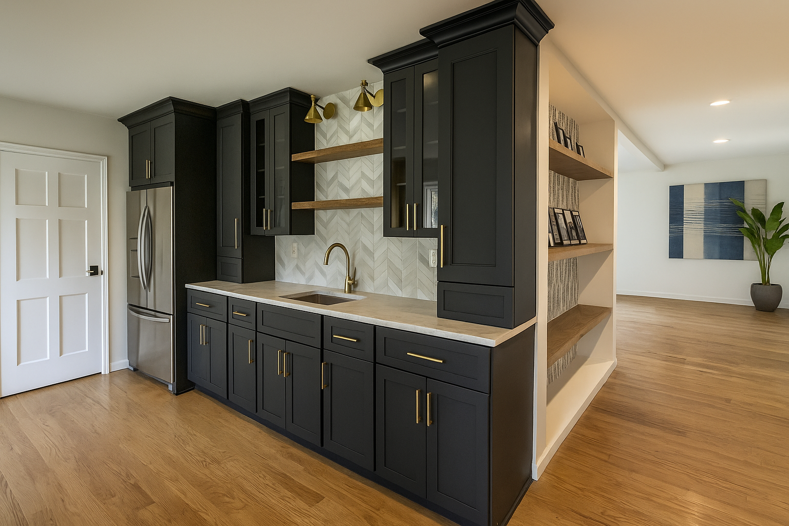 This project showcases a beautifully crafted, expansive basement designed to blend luxury with versatility. The space includes a dedicated office area, a home cinema, and a creative room for painting, catering to a variety of needs and interests. It features a full bathroom and a convenient half-bath, ensuring comfort and accessibility. The wet bar, with its dark gray cabinetry and elegant gold accessories, adds a touch of sophistication, while a striking accent wall provides a focal point for the space. This basement combines practicality with refined design, creating an ideal environment for work, relaxation, and entertainment.