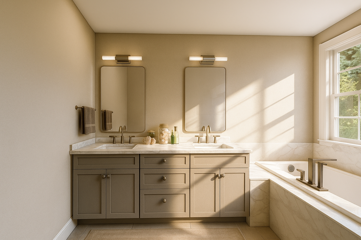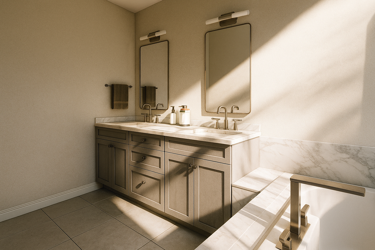 The interior design vision focused on honoring traditional aesthetics while introducing soft, modern touches. The white double vanity sets a clean and balanced foundation, complemented by brushed nickel fixtures that add subtle elegance. The layout emphasizes symmetry and flow, with the built-in tub and custom shower designed to feel luxurious yet timeless. Neutral tones and quality materials were carefully chosen to ensure the bathroom feels calm, cohesive, and enduring in style.