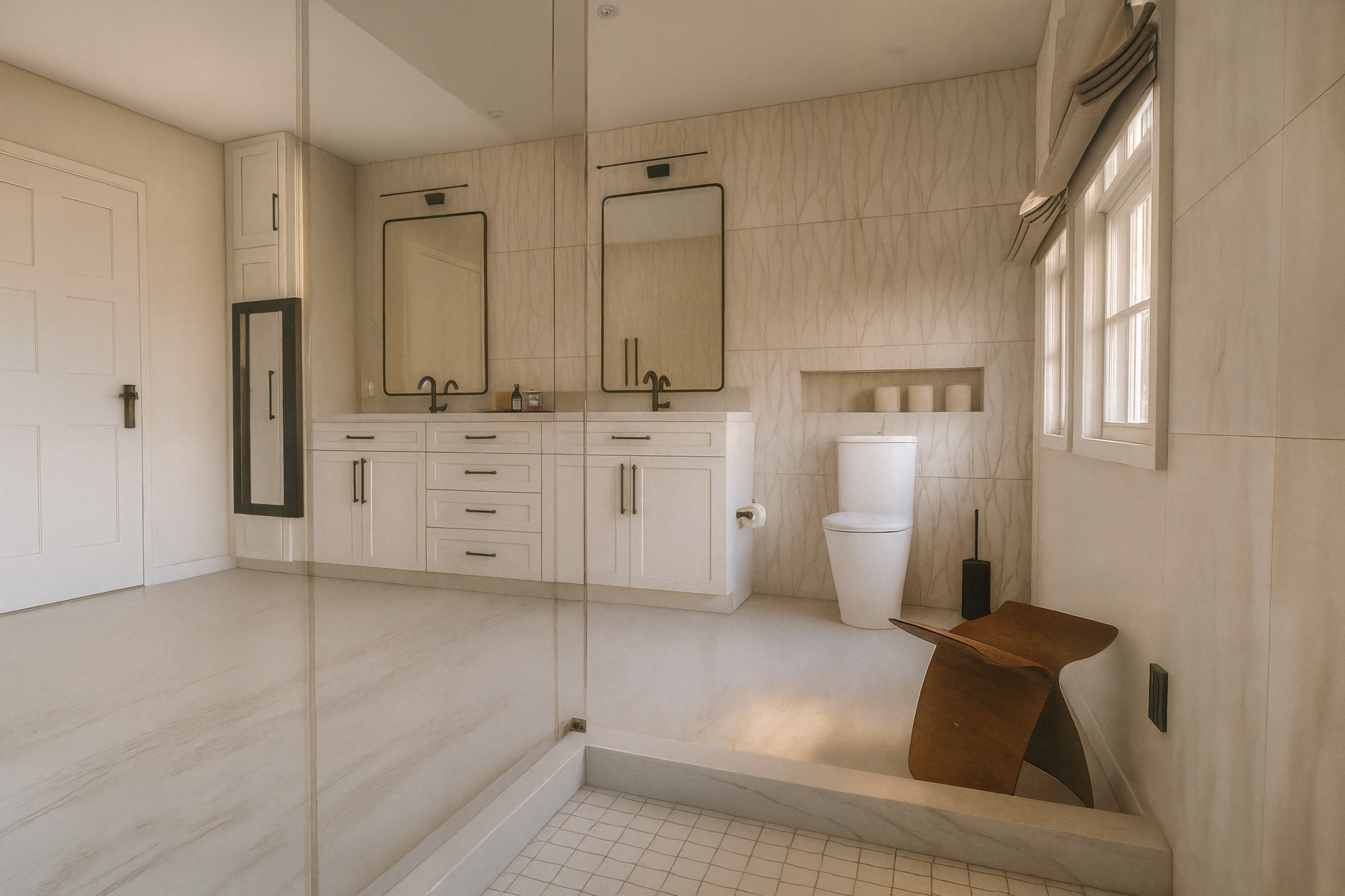 Experience the charm and innovation of our bathroom remodel project through these captivating renders. Merging modern functionality with elegant design, this space offers a perfect balance of style and practicality for everyday living.