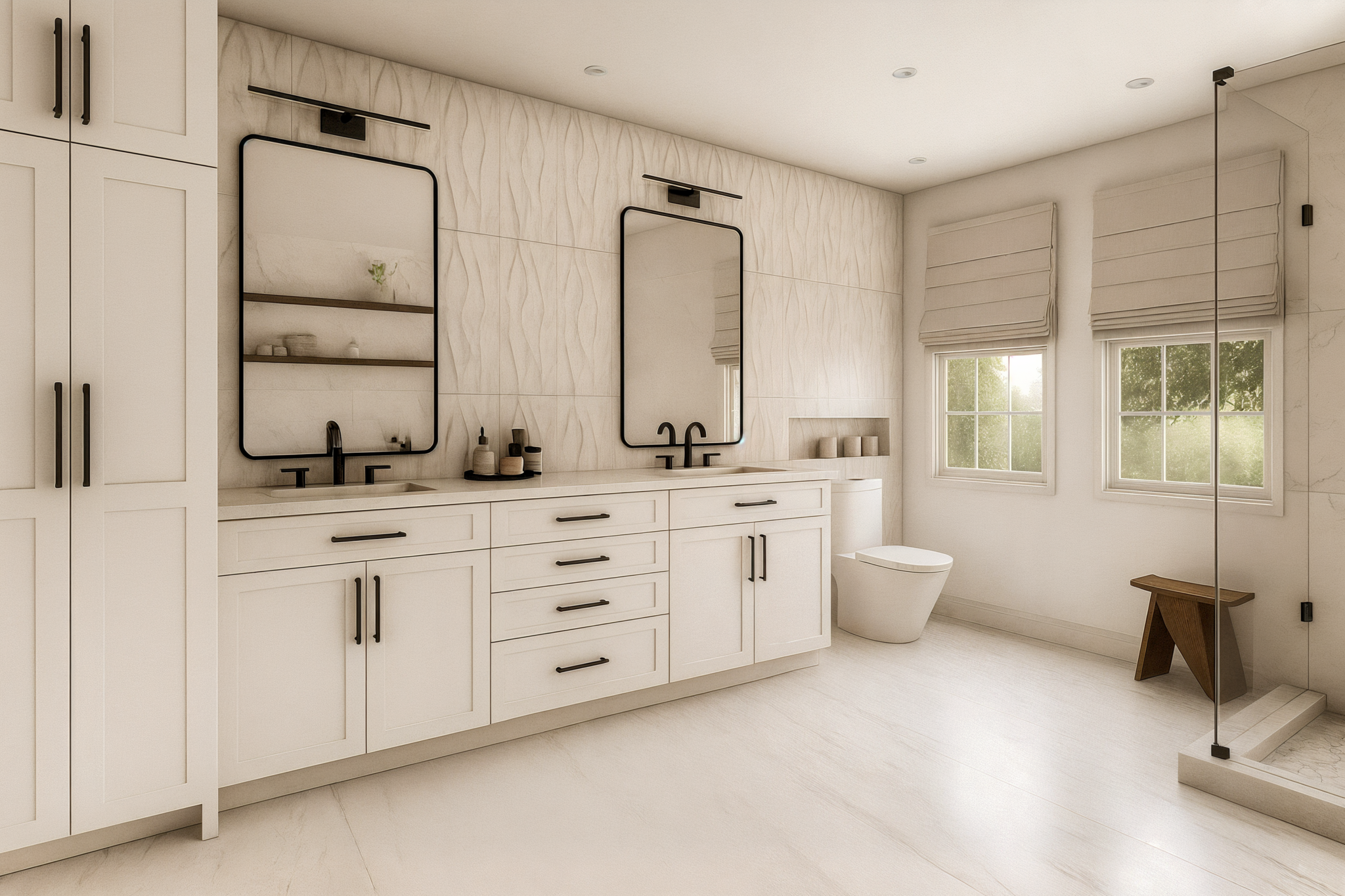 A sleek and modern master bathroom design that blends cutting-edge style with practicality, offering a tranquil space to relax and recharge in contemporary luxury.